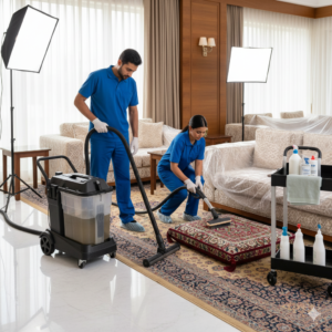 • الصالات والمجالس: إزالة الغبار من الأثاث، تنظيف المفروشات والستائر، تعطير المكان.